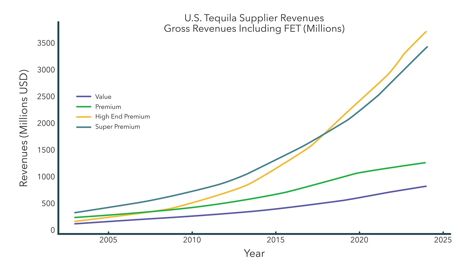 From 2013 to 2023, the U.S. super premium tequila segment surged by more than 400%, a clear indication of the accelerating consumer shift toward higher-end expressions. Premium and high-end premium tequilas also posted strong gains, reinforcing tequila’s status as one of the most dynamic and fast-growing spirits categories worldwide. According to the Distilled Spirits Council, the Super Premium category of Tequila now generates more revenue than any other category.